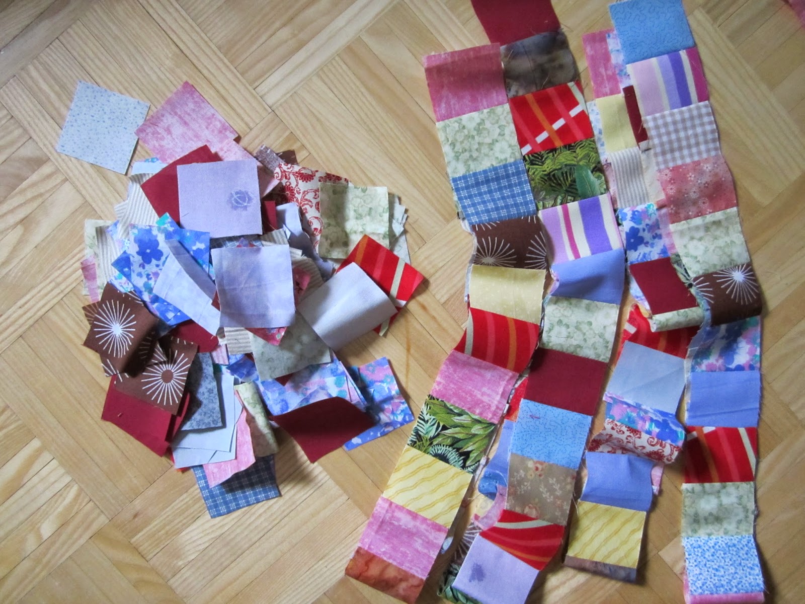 Jag skar till massor med kvadrater att sy rut-remsor av, jag kalkylerade inte åtgången innan jag började skära så nu har jag en hög som kommer att bli över om jag då inte tar och syr mera remsor och lägger till täcket. Jag har använt mej av rester och det känns ju bra så minskar det en aning i den regionen