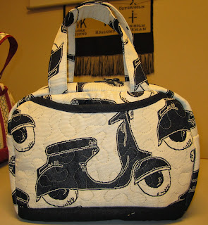 Damerna sydde igen så svetten lackade och jag bjuder här på några foton av väskor som tillverkats under kursen. På bilden ovan ser ni en fantastisk skapelse med perfekt tygval för modellen. Se på handtagen hur snyggt hon har använt randningen!!!!!!!
